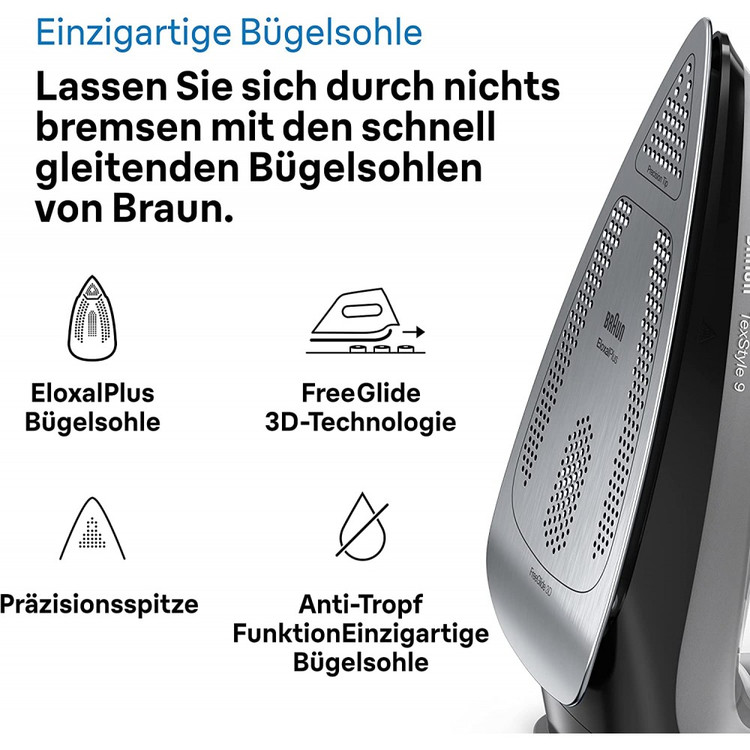 کفی سه بعدی FREEGLIDE: طراحی گرد منحصربفرد، سر خوردن 360 درجه روی هر پارچه را تضمین می کند - حتی به عقب. بنابراین دیگر گرفتار دکمه ها و کیف ها نمی شوید