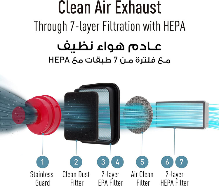 جاروبرقی پاناسونیک خروجی هوای تمیز را از طریق یک سیستم فیلتراسیون 7 لایه با HEPA فراهم می کند. 4 اتصال همه کاره برای مناطق صعب العبور و تمیز، در حالی که مکش قدرتمند تمیز کردن کارآمد را تضمین می کند.