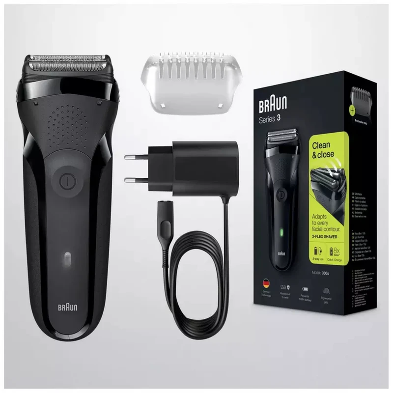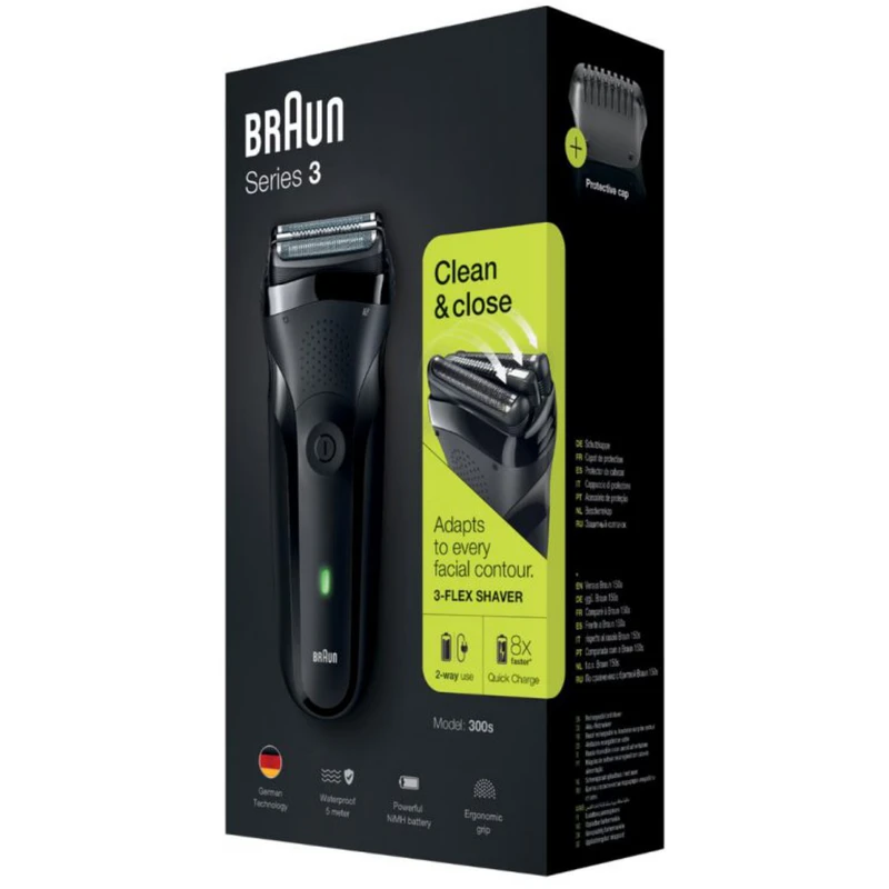 تمامی مدل های ریش تراش سری 3 براون برای دقت و توجه به ریزترین جزئیات در آلمان طراحی و مهندسی شده اند. ریشتراش براون 300s با عدد تیغه انعطاف پذیر و فلکس طراحی شده است که با هر حالت صورت به راحتی سازگار می شود تا حداکثر تماس با پوست و کارایی را در یک حرکت انجام دهد. عناصر برش منحصر بفرد آن حساس به فشار هستند و توسط یک توری فلزی سنسو فویل برای اصلاح بی نقص و عالی با راحتی فوق العاده محافظت می شوند. استفاده از دو منبع باطری قابل شارژ و برق مستقیم در ریشتراش براون مدل 300s کارایی و استفاده از آن را بسیار راحت و لذت بخش می کند تا پوستی نرم بعد از هر اصلاح داشته باشید. عدد تیغه اصلاح رفلکس برای حداکثر تماس با پوست با هر ناحیه از صورت سازگار می شوند و با فشار کمی روی صورت می توانید اصلاحی راحت و ملایم داشته باشید. حتی روی ریش های سخت 3 روزه نیز بهترین اصلاح را انجام می دهد.تیغه های فلکس براون سری 3 به راحتی با هر حالت صورت سازگار می شوند با اصلاحی بی نقص را انجام دهند. دو ردیف شیارهای ظریف با فاصله یکنواخت برای کمک به هدایت مو به داخل تیغه های فویلی برای اصلاح کارآمد و راحت. موهای نرم و خوابیده به کمک تیغه میکروگریپ آماده اصلاح می شوند و به طرف تیغه های فویلی که در دو طرف قرار دارند، هدایت می شوند تا هیچ مویی فراموش نشود. میکروگریپ باعث می شود که هم سریع تر اصلاح انجام بدید و هم با ملایم بیشتر کار را انجام بدید.تیغه های حساس به فشار ریشتراش براون به طور خودکار جمع می شوند تا از پوست شما در برابر فشار زیاد محافظت کنند. برای اصلاح ملایم و احساس صافی پوست. هنگامی که دستگاه ریش تراش روی پوست صورت قرار می گیرد، فشار مناسب به کمک حالت شناور بودن و متحرک بودن تیغه ها کنترل می شود. با کمترین فشار روی پوست تیغه های فویلی کار اصلاح را شروع می کنند.شارژ کامل در یک ساعت انجام می شود و می توان 30 دقیقه با آن اصلاح انجام داد. همچنین با برق مستقیم هم می توانید تا هر زمان که بخواهید اصلاح انجام بدهید و نگران تمام شدن باطری آن نباشید. البته شارژ سریع 5 دقیقه ای برای یک اصلاح کامل را هم دارد. کاملا ضدآب می باشد که بهداشت و تمیز کردن آن را بسیار راحت و آسان می کند. با خیال راحت دستگاه را زیر شیر آب بگیرید و تمام اجزای برش آن را تمیز کنید تا برای اصلاح بعدی کاملا آماده باشد