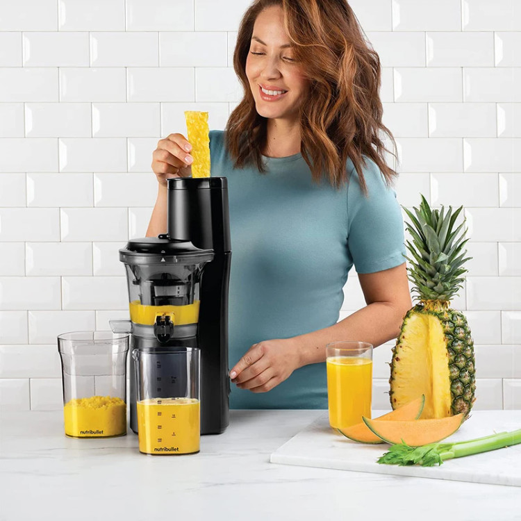سرعت آهسته تر برای یک آب گیری آرام تر و ملایم تر (و صبحگاهی) طراحی شده است. مزیت خوب دیگر این محصول قابلیت چرخش معکوس بوده که بعد از قرار دادن میوه ها و سبزیجات داخل دستگاه و چند بار چرخش، اگر مجدداً این بار چرخش را در حالت معکوس REV انجام دهید می بینید که باز هم آب میوه برای خارج شدن وجود دارد. با کمک عصاره گیر نوتریبولت مدل NBJ300 با توان 150 وات بدون زحمت زیاد انواع آب میوه ها و اسموتی ها را تهیه کرده و دورهمی های خود را جذاب تر کنید.