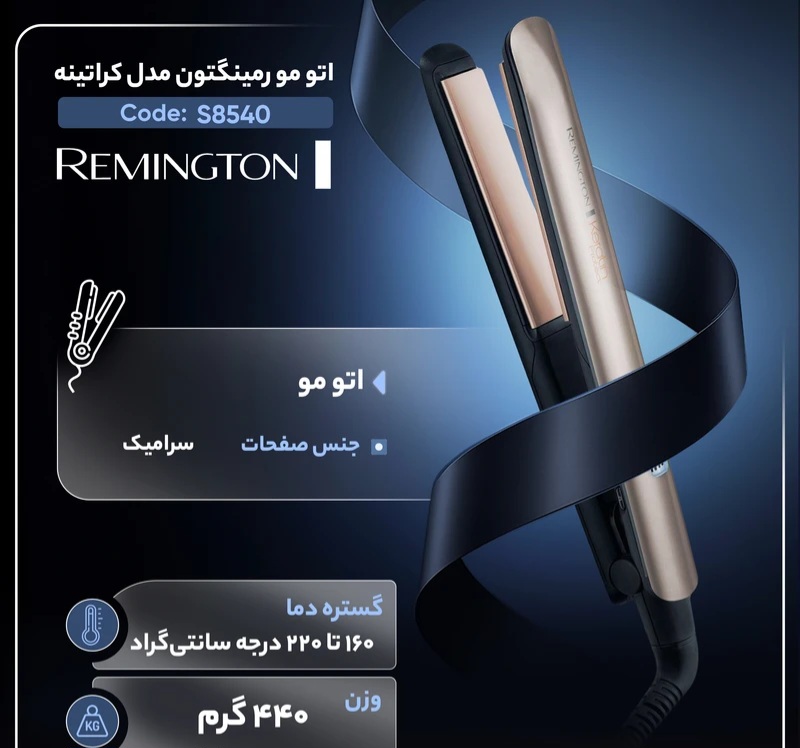 اتو مو رمینگتون مدل کراتینه S8540، محصولی از برند رمینگتون، فرمدهی سریع و ایمنی حرارتی را همزمان ارائه میدهد. ابعاد ۳۷۰ × ۱۶۰ × ۹۰ میلیمتر و وزن ۴۴۰ گرم استفاده راحت را تضمین میکند و سیم گردان ۱.۸ متری آزادی حرکت کافی هنگام کار فراهم میکند. صفحات سرامیک شناور با طول ۱۱۰ میلیمتر حرارت را یکنواخت منتقل میکنند تا موها صاف، لطیف و بدون کشش صاف شوند. بازه دمایی ۱۵۰ تا ۲۳۰ درجه سانتیگراد با ۹ حالت قابل تنظیم، امکان سازگاری با انواع بافت مو را فراهم میکند و تجربهای دقیق از کنترل حرارت ارائه میدهد. زمان گرم شدن حدود ۱۵ ثانیه است و خاموشی خودکار پس از ۶۰ دقیقه ایمنی استفاده را افزایش میدهد. طراحی ارگونومیک و دوام بالای این اتو آن را به گزینهای مناسب برای داشتن موهای صاف و درخشان در استفاده روزانه تبدیل میکند.